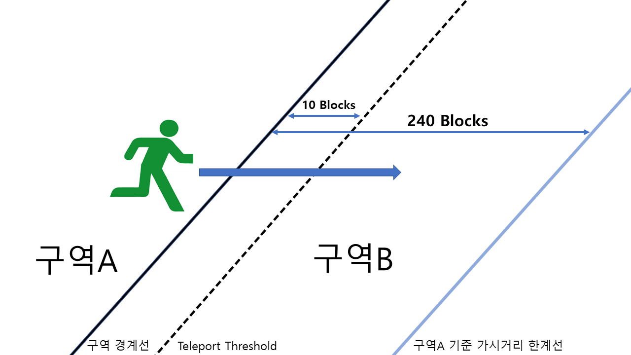플레이어는 구역A의 경계를 벗어난후 Teleport Threshold를 넘어가면 구역B의 서버로 이동