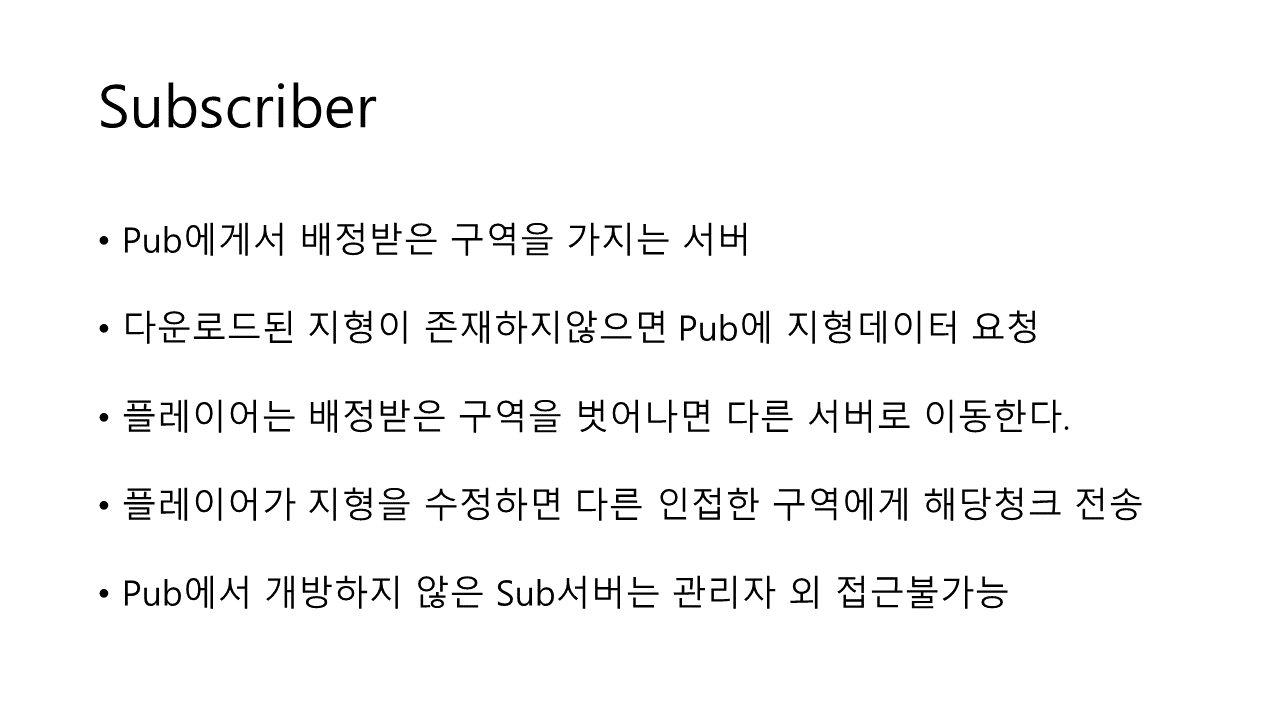 - Pub : 구역 편집, 수정 , 각서버로 구역 배정 / Sub : 해당 서버에 구역 할당